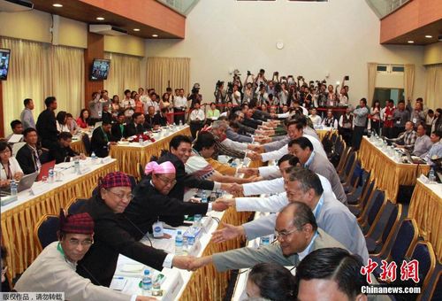 3月17日,在缅甸仰光,谈判双方在第七轮和谈开幕式上握手。当日,缅甸政府与少数民族地方武装开始举行第七轮和谈。谈判双方均强调政治解决冲突,同意寻求减少冲突的办法。新华社发(吴昂摄)
