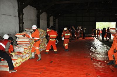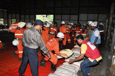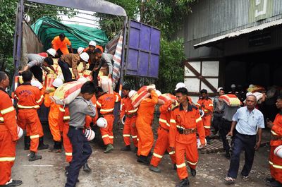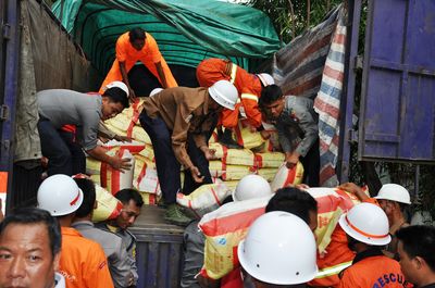 货车上载运的米包、干粮等物资,立即由已准备待命的缅甸消防队员们搬运至货仓内。这些物资将随后输送至急需的灾区。中国云南省政府的此次及时的行动体现了真正胞波情,深受缅甸人民的点赞。