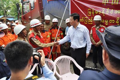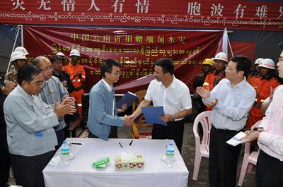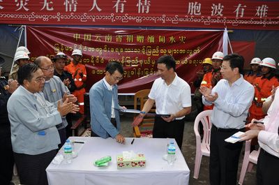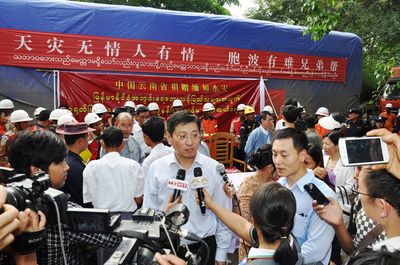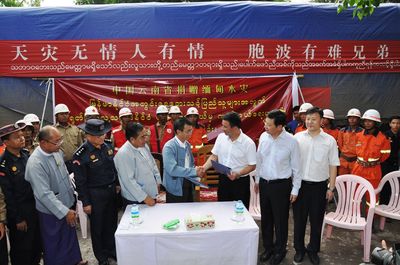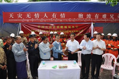 8月7日下午4时左右,14辆承载中国云南省政府向缅甸水灾灾民捐赠物资的大型货车队,抵达曼德勒大佛寺普雅吉南边的省政府救灾物质仓库总部。中国大货车队驶入曼德勒市区内时,每辆货车车身上挂着醒目的 ‘天灾无情人有情 胞波有难兄弟帮’中缅文横幅大标语,吸引了广大市民的眼球。