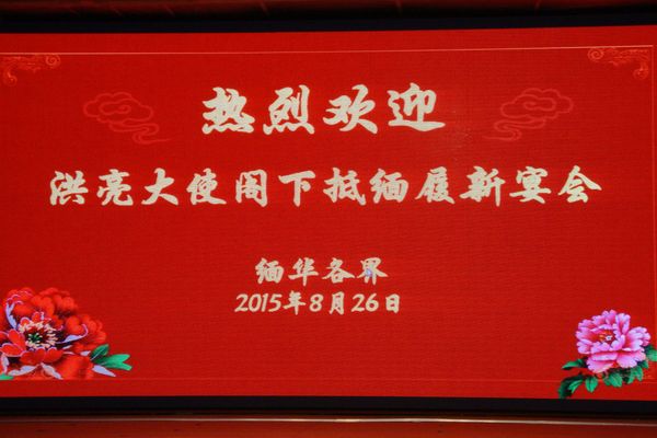 缅华各界侨团代表于2015年8月26日下午6时假座缅甸华商总会礼堂举盛大宴会,热烈欢迎中华人民共和国驻缅甸联邦共和国特命全权大使洪亮阁下抵缅履新。中国驻缅大使馆陈辰公使参赞、王瑞青参赞、王晓初主任及使领馆各位领导出席了欢迎晚宴,缅华各界侨团代表三百多人出席了欢迎宴会。