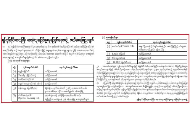 仰光省消费者争议解决委员会,从市场上取样,经过化验,发现有10种“纯正花生油”并不纯正。其中有6种品牌是参杂了其它食用油,这6种品牌是:瑞莫、Family、上特等、瑞新、盛德勒普、Golden apple。还有4种品牌,标明是“纯正花生油”。其实根本不是花生油,而是道道地地的棕榈油。这4种品牌是:都温那迪、Lucky、SS、Hi plus。对以上欺骗消费者的企业,将严格追究。