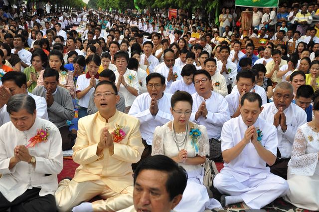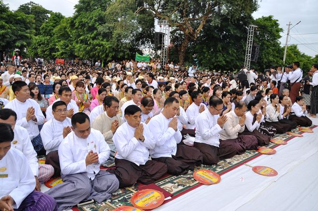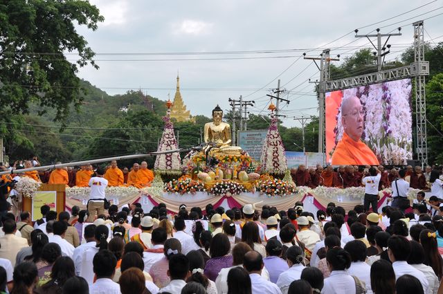2015年9月20日,早上6:00时,在曼德勒护城河边举行缅甸-泰国联合举办的僧侣布施大会,万名僧侣参加此次布施仪式,场面格外壮观。万名僧侣分别是由来自泰国的100名僧侣与来自曼德勒各寺庙的9000多名僧侣。上万名曼德勒市民,以及来自泰国的善男信女,在护城河边的街道旁,有秩序地蹲坐,向僧侣们布施早膳、物品及善款。