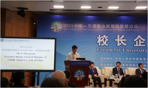 在“校长企业合作洽谈会”上,中有色集团驻仰光代表李洪元总经理表示,中有色在缅甸的达贡山镍项目是在所有东盟国家中最大的项目。目前面临的最大问题是:缅甸当地冶金人才缺少,急需与职教院校合作,为其培养劳动人才。