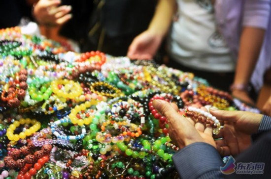 图片说明:花花绿绿的手链吸引了不少游客挑选