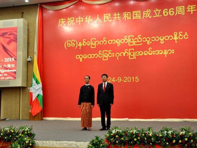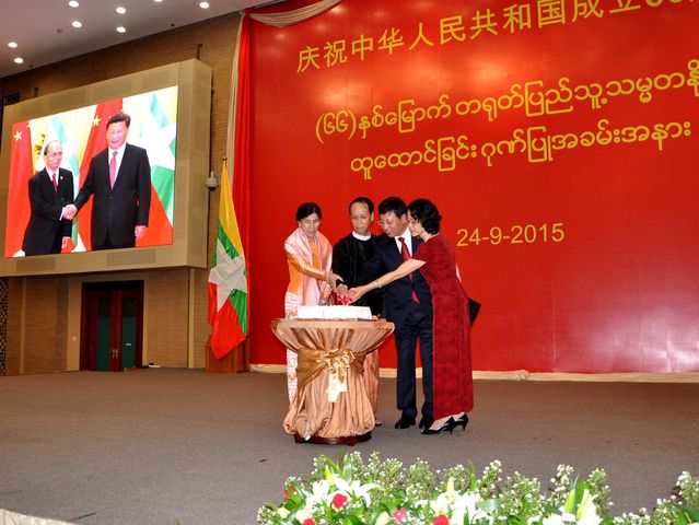 2015年9月24日,洪亮大使夫妇在内比都第二国际会议中心举行国庆招待会,隆重庆祝中华人民共和国66周年华诞。缅甸副总统赛茂康夫妇,国家计划与经济发展部部长甘佐、宣传部部长耶图、商务部部长温敏、农业部部长敏莱、宗教部部长梭温等10余位正副部长,以及缅政府、议会、政党、社会友好人士和中资机构代表共500多人出席了招待会。这是中国驻缅甸大使馆首次在内比都举办国庆招待会,也是目前第一个在内比都举办国庆招待会的外国使馆。