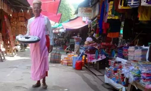 市场里的女尼姑,缅甸的和尚都是穿深红色的袍子,而女尼姑都是穿漂亮的粉红色。