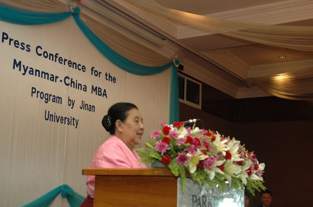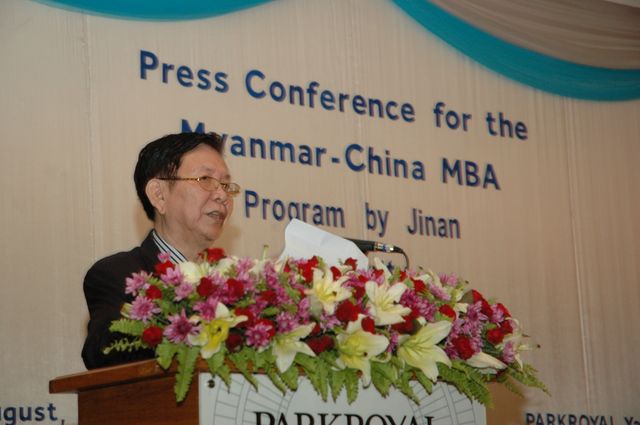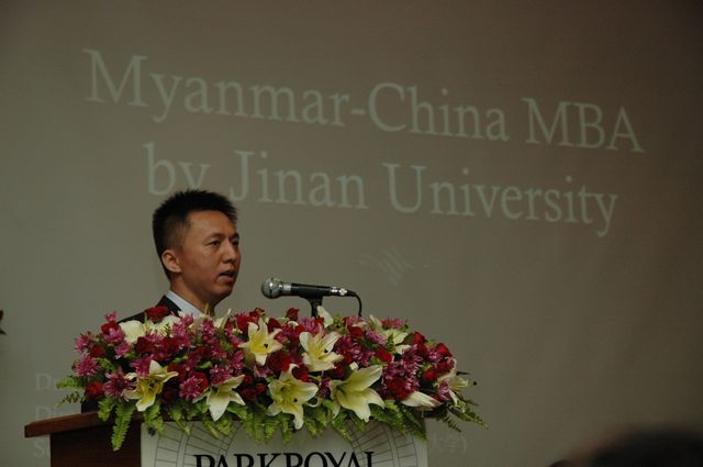 由广州暨南大学工商管理学院和缅甸华商商会就联合在仰光开办MBA项目培训班新闻发布会,于2012年8月5日上午9时假座Park Royal Hotal 大礼堂举行,中国驻缅甸大使馆文化参赞高华先生、领事主任卫修锋先生、张鹏秘书、仰光大学经济学院MBA项目耆宿杜腊敏博士及仰光大学经济学院博士生、仰光省政府官员、缅华各侨团负责人、年轻学子和仰光各报章新闻记者等共约一百五十人出席了新闻发布会。