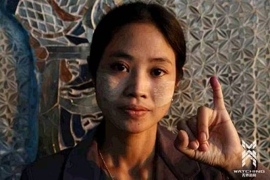 2015年11月8日,缅甸民众参加大选投票后展示手指上的墨迹。