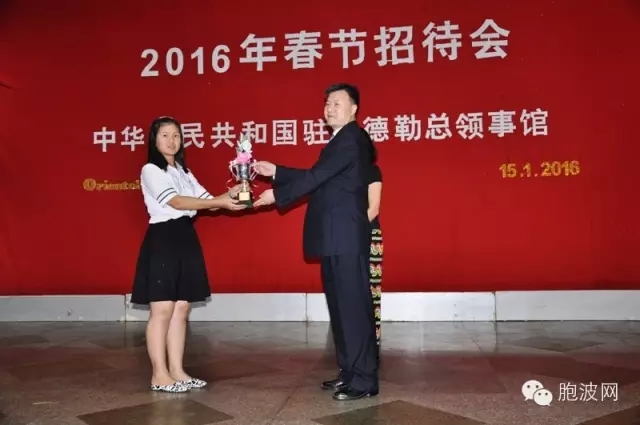 2016年1月15日晚上6时,中国驻曼德勒总领事馆2016年春节招待会在曼德勒东方屋举行,作为首次增设节目,总领馆王愚总领事和靳仪麟副总领事分别为本次“胞波-迎新杯”汉语征文比赛前三名和7名鼓励奖获得者颁奖。
