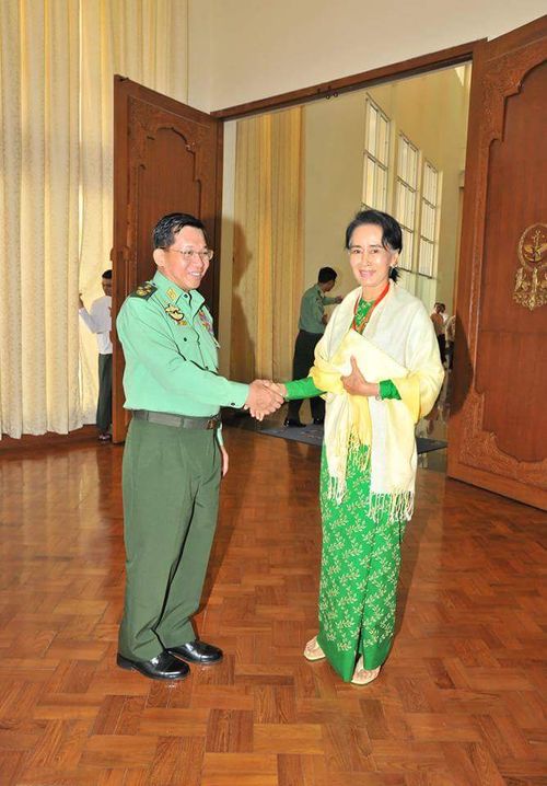 闻防军总参谋长敏昂莱大将1月25日下午2时至4时在内比都勃印闹别墅会客厅与民盟主席杜昂山素姬会唔。