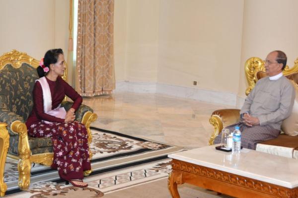 当地时间12月2日,缅甸首都内比都,昂山素季与总统吴登盛会晤。 路透社 图