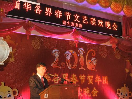 2016年春节筹委会主任张文钦先生在致辞中强调,要教育好下一代,为发展中缅友谊而努力。接着,民盟荣誉主席吴丁乌讲话,他首先以汉语“恭喜发财”向来宾们表示祝贺,并用汉语高呼“中缅友好万岁、万岁、万万岁!”引致全场热烈掌声雷动。吴丁乌表示中缅友谊源远流长,吴丁乌特别回忆起他作为缅甸军方代表前往中国参加中华人民共和国成立十五周年的庆典活动,受到毛泽东主席、周恩来总理、陈毅元帅等许多中国老一辈领导人的接见和会谈,参观了许多北京、上海、武汉、杭州、广州、昆明等许多中国大城市,受到热情款待,特别感受到中国领导人朴实作风和平易近人态度,以及对中缅友好的重视,至今仍然清晰地留在脑海中。吴丁乌最后再以“中缅友好万岁、万岁、万万岁”结束他热情洋溢的讲话。