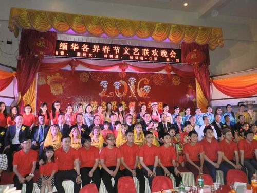 缅华各界于2016年2月8日(农历丙申年正月初 一日)假座梅花皇宫大酒家举行庆祝春 节盛大文娱联欢晚会。中华人民共和国驻缅甸联邦共和国特命全权大使洪亮先生、陈辰参赞及使领馆领导们出席了晚会,应邀出席晚会还有民盟中央荣誉主席吴丁乌将军(退休)及民盟中委员们,缅中友好协会主席吴盛温昂及缅中友协常务理事们、仰光省政府负责人等。出席联欢晚会的还有缅华各界代表们。