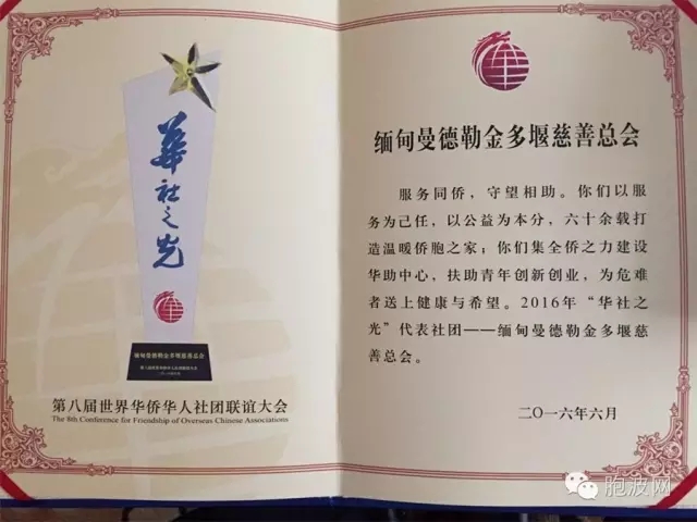 缅甸曼德勒金多堰慈善总会荣获国侨办“华社之光”荣誉称号