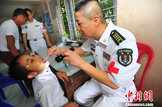 医疗队员为缅甸小朋友检查口腔。 许旭佳 摄