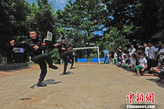 教室门口的空地上,编队特战队员为小朋友们表演起中国功夫。看着虎虎生风的拳术表演,12岁的苏穆茂跃跃欲试。在场的老师告诉记者,苏穆茂看过中国功夫电视片段,见到真人表演非常兴奋。