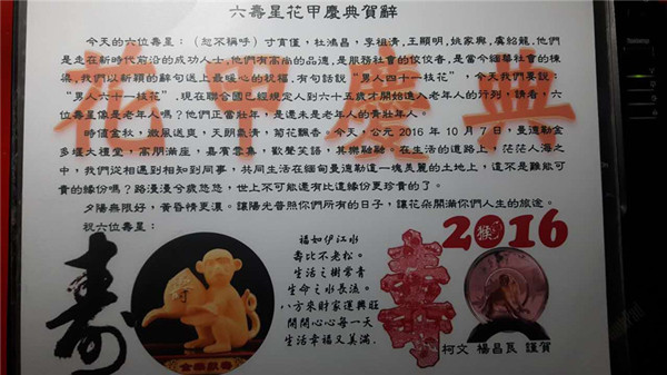 在“花甲寿宴”中,最具特色的是典礼台中央长长的、摆满丰盛食物及生日蛋糕的寿席大桌。寿席大桌的后面摆上以青松、鹤、梅花鹿等代表长寿的图案为主的屏风,过寿老人身上左右两边披上色泽鲜艳的红色披带,寓意吉利和平安,站在寿宴礼堂的前方中央。而过寿的夫妻之中,不论哪个人过“花甲寿宴”,另一个人也要一同陪在旁边。如有同岁的亲朋好友一起过寿,届时将举办集体的“花甲寿宴”,此次笔者所碰见的“花甲寿宴”正是一场由六位寿星集体举行的隆重的庆寿仪式,颇为壮观。由于2016年为丙申,红猴年,大家笑称此次集体举办的“花甲寿宴”的六位寿星为“六老龄童”。筹办方也刻意选取大家耳熟能详的《西游记》的主题曲作为背景音乐。寿宴邀请的对象一般分为“内”、“外”两层。“内层”包括本家族直系亲属、亲家以及旁系两代以内的近亲属;“外层”包括除血缘、亲缘因素之外的做寿者本人的朋友、邻居、同事以及做寿者配偶及其子女的朋友、邻居、同事等。
