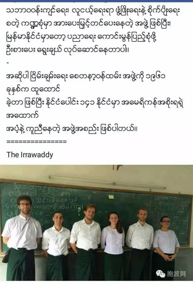 这都不为奇怪,让人瞪大眼睛的是一张照片:一组6个白人‘老外’,满脸笑容,全身穿着‘缅装’:‘绿纱笼白衬衫以及拖鞋’(缅甸学校教师的标配)!要不是其中三位的‘络腮胡子’以及‘西方白人面孔’,简直可以“消失”在缅人学生中!下面的‘评论’更让人‘羡慕嫉妒恨’!——绵绵不绝的点赞喝彩恰恰与社交网站facebook及当地媒体‘逢中必反’、‘逢德祐必骂’的‘骂声一片’形成鲜明的对比!