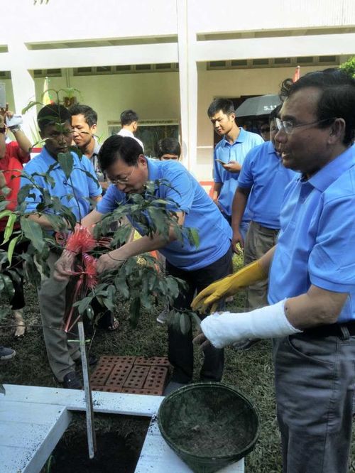 之后,在天然公园水族展馆附近已安排好的地方,在洪亮大使和吴鹏伦部长带领下,贵宾众人一起动手兴高采烈地种植了准备好的友谊树苗。