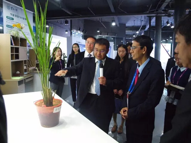 在项目展示区,吴昂都部长详细了解了云南农垦集团、以及云南大学的“云百草”、多年生水稻、环保节能PBM新材料项目。云南大学胡凤益教授为吴昂都部长详细介绍了多年生水稻项目,多年生水稻可以实现种植一年,连续不减产收割3—5年,有效地节约了劳动成本和时间成本。吴昂都部长问:“冬天的时候,这些水稻怎么过冬?”胡凤益教授解释道,多年生水稻是由非洲的长雄野生稻杂交而来,拥有发达的地下根茎,具有多年生长性、抗病虫害性,良好的越冬能力,产量稳定等特点。