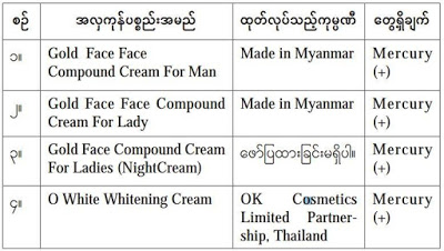 缅甸卫生与体育部公布一批不合格而有害于健康的化妆品名单,提醒人们加以注意。该 四种化妆品并没有在药物管理局注册,并发现掺入化学禁止品(玛洲里)(水银),对健康有害物质。该(玛州里)水银物质对皮肤将产生骚痒、肿胀、红白斑块,从皮肤入侵体造成疲劳、头疼等征状,长期使用可影响至肾脏疾病。