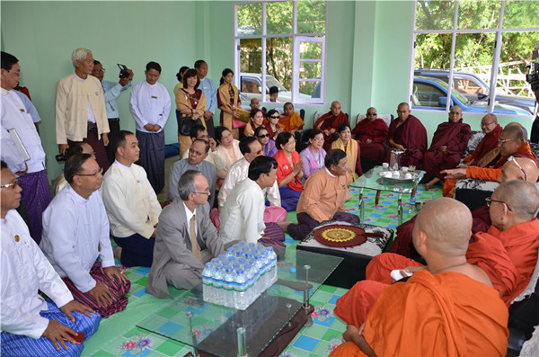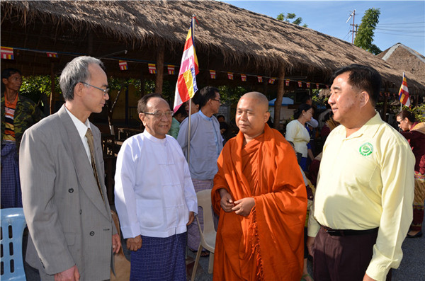 不一会儿,只听得交警口哨声大起,又是一阵呼喊‘来了!来了!’一辆普通轿车中,下来一批‘大人’——曼德勒省省长佐敏貌及市长一行。这时夹道欢迎的人群(此次主要施主)曼德勒金多堰妇女慈善会全体姐妹的欢迎掌声响起。