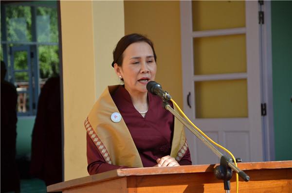 李菊芳会长感谢了对此次‘布施’有贡献的所有姐妹会员!她还特意介绍了‘金多堰’的历史——五百年前‘德祐’(华人)前辈顺伊江而下的最早落脚地!今天生活在缅甸曼德勒这块福地的‘德祐胞波’们,不忘记回报这块土地的养育之恩,为当地献上微薄之力,旨在帮助贫困的孩子们能有一个舒适的学习环境!