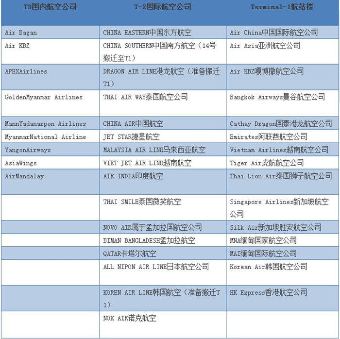 对于往返于中国大陆与仰光的乘客,这里还有一个重要的信息是,从12月14日起,中国南方航空公司将搬迁至T1航站楼运营,解释,进港与出港航班的办理手续均将在T1进行。