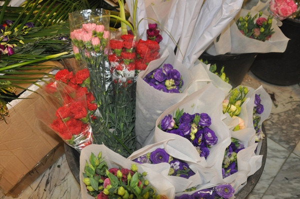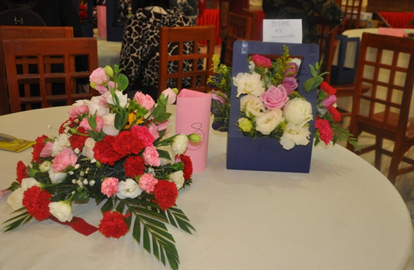 上午肖老师给大家培训如何插花篮,再由学员六人一组插花篮,随后老师给每个组一一点评,而且还让学员们给自己的花篮取名字。肖老师对学员们的花篮给了好评,没想到学员们那么有创意,取名都很有意义,如:新年如意,唯一,友谊之花等等。下午老师给学员们上会议插花和胸花。