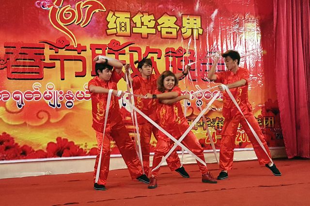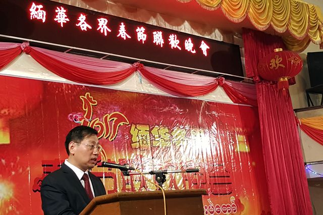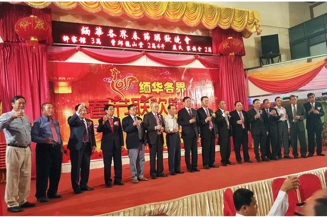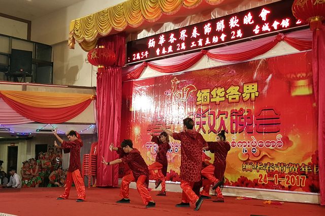 缅华各界于2017年1月24日下午六时假座梅花皇宫酒家举行盛大文艺联欢晚会,热烈庆祝2017年春节来临。中国驻缅甸特命全权大使洪亮、缅甸民主联盟(民盟)荣誉主席吴丁乌、仰光市市长吴貌貌梭、若开事务部部长吴佐埃貌、缅中友好协会副主席吴梭温、警察署长、88组织主席吴哥哥支、仰光省人民议会副议长吴林莱敏、中国浙江省政协主席屠国定等出席了联欢晚会。