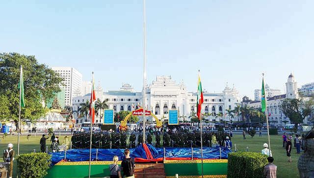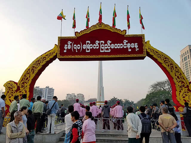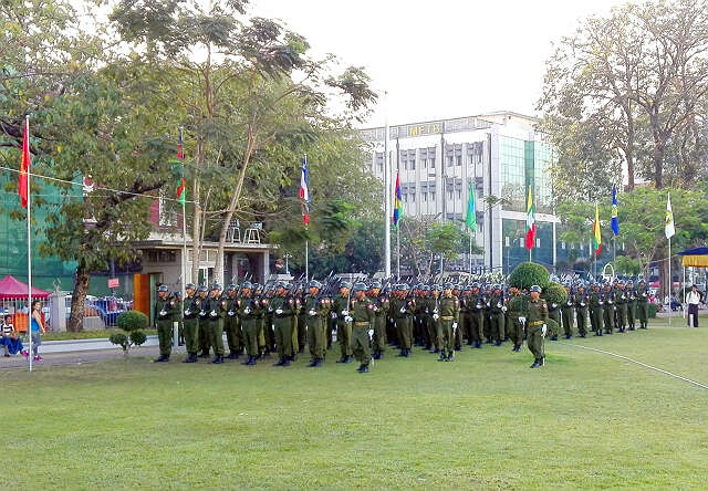 2017年2月12日是缅甸联邦节,仰光市政府为了隆重庆祝即将来临的七十周年联邦节纪念日,在市政厅大厦前的“苏丽公园”举行阅兵式演练,并有学生组成的铜乐队参与演练。