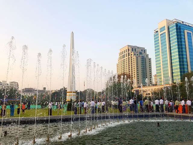 “苏丽”公园是仰光市民晨运的好地方,昨天人们还能近距离在公园内观看学生和军人的演练,今天已森严戒备,武警十步一哨,将公园外墙围了一圈,不过人们还是可以在公园围墙外晨运,也可以随意拍照。仰光“苏丽”公园内的庆祝联邦节七十周年的准备工作紧张有序地进行着,人们可以感觉到浓浓的节日气氛。