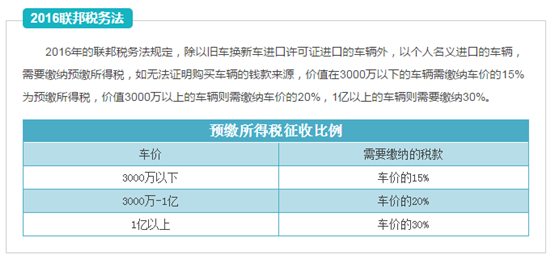2016年的联邦税务法规定,除以旧车换新车进口许可证进口的车辆外,以个人名义进口的车辆,需要缴纳预缴所得税,如无法证明购买车辆的钱款来源,价值在3000万以下的车辆需缴纳车价的15%为预缴所得税,价值3000万以上的车辆则需缴纳车价的20%,1亿以上的车辆则需要缴纳30%。