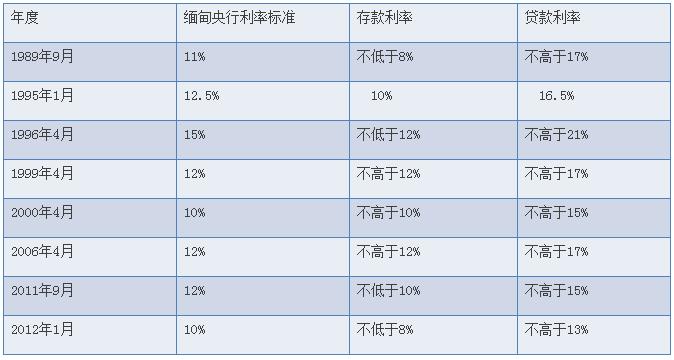 缅甸在历届政府执政时期曾8次调整过银行贷款利率。在吴登盛政府执政时期的2011年9月和2012年1月就曾两次调整贷款利率。