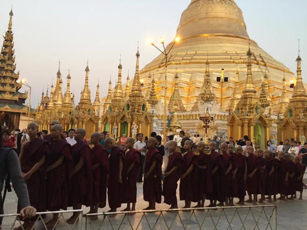 缅甸首站,即参访灵鹫山教团创办人心道法师位在仰光的大善园寺国际禅修中心,逾百僧信热烈欢迎、锣鼓喧天,会中礼请到缅甸全国上座部佛教僧伽主席鸠摩罗毗文沙尊者、副僧王胜智毗文沙、三藏比丘孙伦尊者等与汉传比丘同登大座,平等互动。