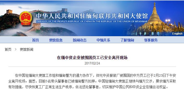 据中国驻缅甸大使馆网站2月24日消息:在中国驻缅甸大使馆工作组和缅甸警方的通力协作下,仰光中资服装厂被围困的中方员工已于2月23日下午安全离开现场。据悉,目前5名带头肇事者已被缅甸警方扣押。