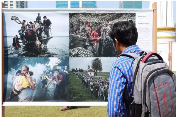 马哈班杜拉公园内举行的世界新闻摄影展上讨论展出的摄影作品