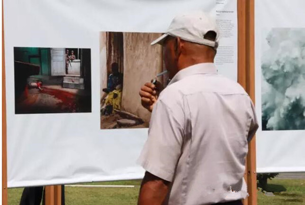一名观众7日在欣赏瑞典摄影师尼克拉斯·哈马斯特朗姆拍摄的作品前点燃了一根香烟,