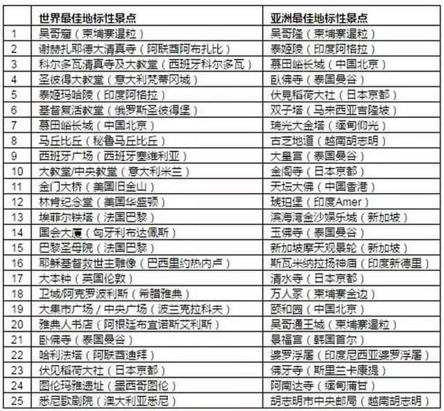 此外,日本京都的伏见稻荷大社、金阁寺、清水寺、马拉西亚吉隆坡的双子塔、越南胡志明的古芝地道、香港的天坛大佛、印度Amer的琥珀堡、新加坡的滨海湾金沙娱乐城、新加坡摩天观景轮等都上榜。TripAdvisor表示,该排名名单,为更加12个月国际游客的评论及旅游人次,评选而出。
