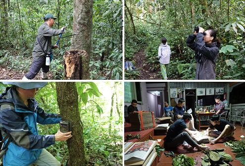 取树心(左上)鸟类观测(右上)安置红外相机(左下)整理标本(右下)