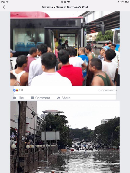 气象台发布告示,六月一日,由于暴雨袭击,密支那水位曾达到798cm,该水流继续往下流冲,未来五天至七天内,伊江两岸八莫、瑞谷、卡通达、直泊京的水位将上涨11英尺至13英尺,曼德勒、实阶、敏巫及木各具、良乌、稍埠、马奎、卑谬将比目前的水位上涨11英尺左右。