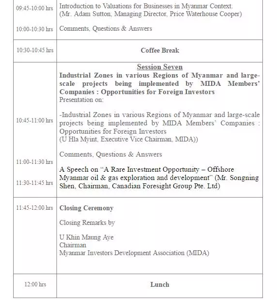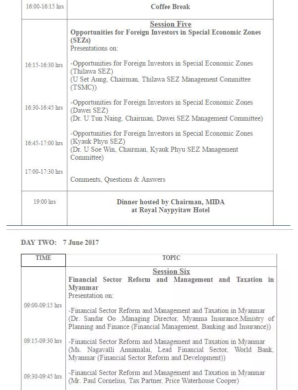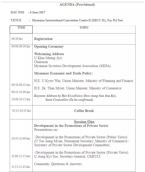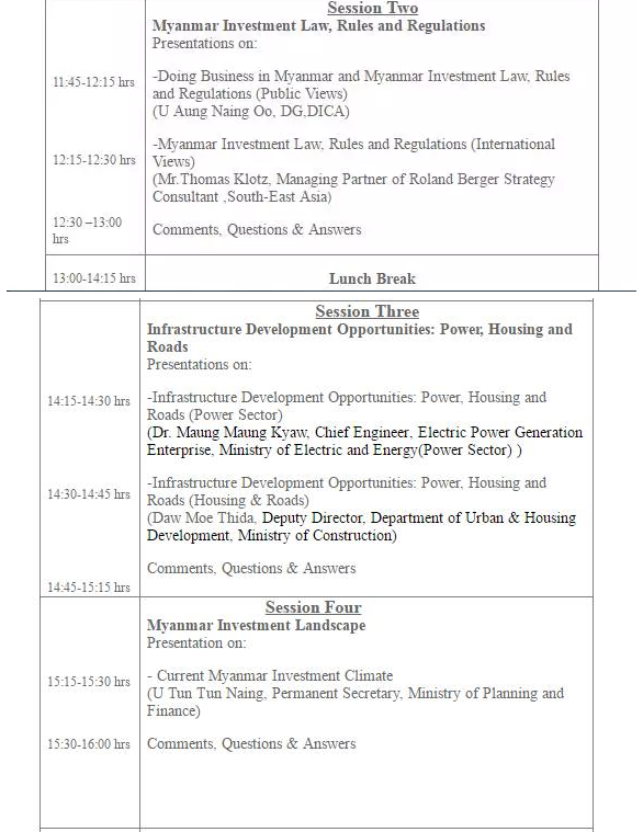 为期两天的论坛会议中,第一天的议程将会涉及个体(私人)经济的发展,《缅甸新投资法实施细则》的解读、基础设施建设投资之路、我国经济特区介绍等议题。