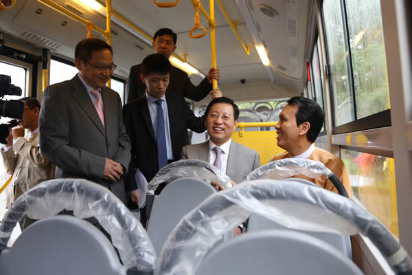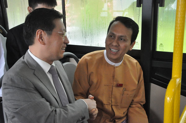 洪大使和吴漂民登首席部长等共同乘坐了宇通和安凯公交车,亲身体验车辆运行状况和坐乘感受,听取宇通公司和安凯公司代表就车辆动力改装和车体特殊防锈处理等情况汇报。吴漂民登首席部长对中国产公交车给予高度评价,表示中国产公交车车体宽敞明亮,乘坐安静舒适,过弯平稳顺畅,这将极大提升仰光对外形象,并给广大市民出行带来更多便利。