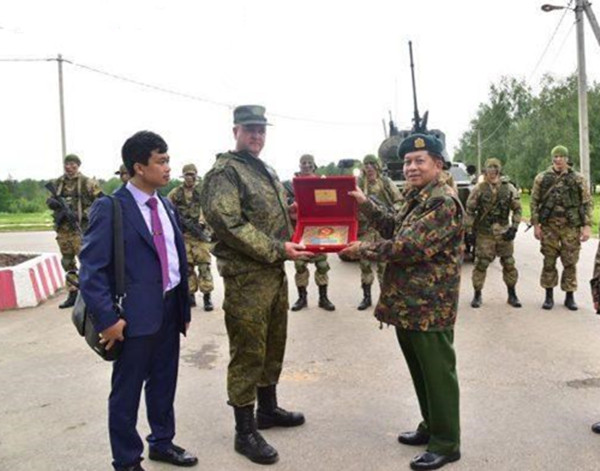 缅军发布消息称,6月19日上午,出访俄罗斯的缅军总司令敏昂莱大将参观了纳罗福明斯克市的坦克师总部。