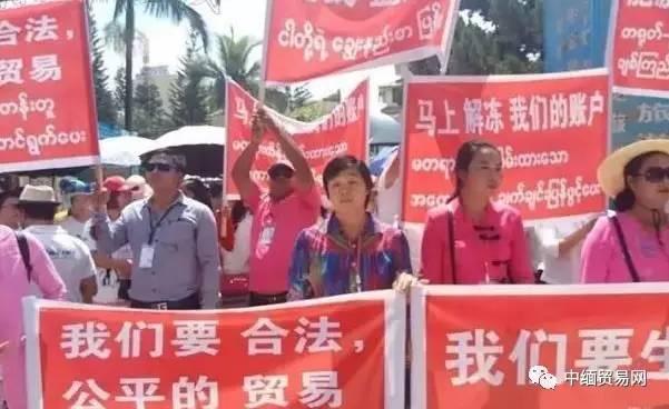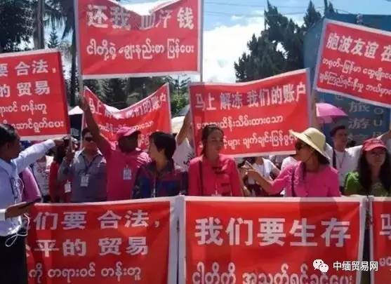 示威者打出,“我们要生存”、“胞波友谊在哪里”、“还我们血汗钱”、“马上解冻我们的账户”、“我们要合法、公平的贸易”等标语。