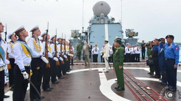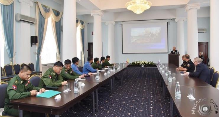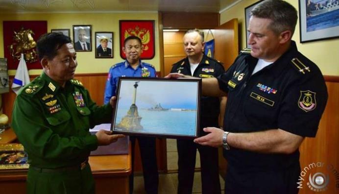 据缅甸在线日前报道 6月22日上午,缅军总司令敏昂莱大将在俄罗斯塞瓦斯托波尔市黑海舰队司令部会见黑海舰队司令Kulekov Valaydii。