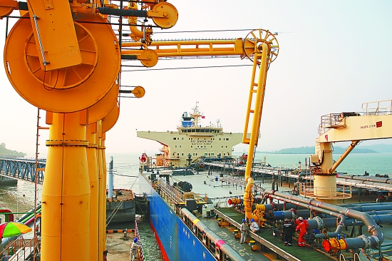 港口灯火通明 卸油臂与“联合动力”号油轮对接