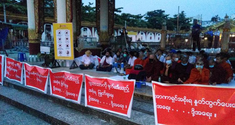同样的,在曼德勒2500诵经堂也有三十名僧侣与平民组成的示威者设立示威行营,呼喊口号反对政府。
