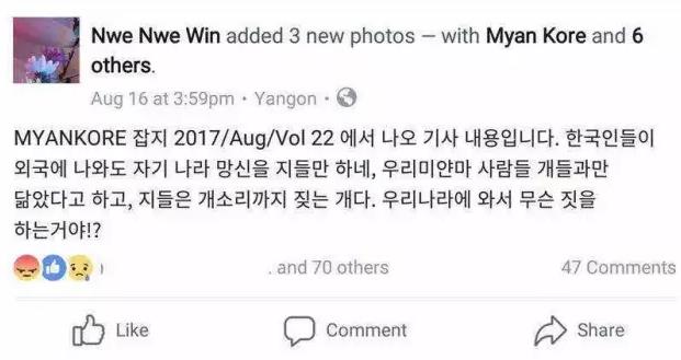 在缅发行的韩国杂志发表用狗来做比喻的侮辱当地人的评论文章