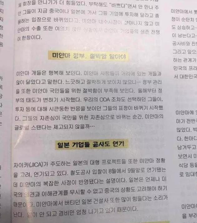 日前在缅甸发行的唯一一份韩文杂志Myankore Business &Lifestyle magazing(缅句丽-经济与生活杂志)在8月份发行的第二十二期期刊上发表的一篇评论文章,文中形容当地人就如同狗一样的无忧无虑的生活,与路边流浪狗无多大差异,一有空时喜欢闲扯胡聊吹牛皮,没有努力奋斗的精神,包括政府管理人员和民众,极缺少积极向上的冲动。